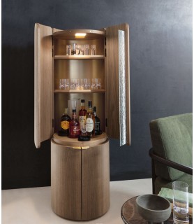 16.842,72 € 19.814,96 € -15%Mueble bar de dos compartimientos en nogal canaletta con puertas curvadas y detalle en cristal Ice. Compartimiento superior con fondo revestido de latón cepillado con dos repisas de madera. Compartimiento inferior con repisa de madera. Iluminación superior LED recargable por USB con sensor de presencia.