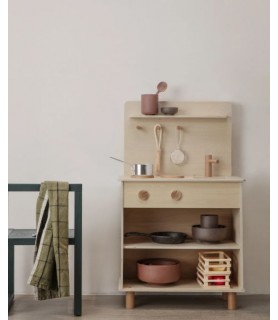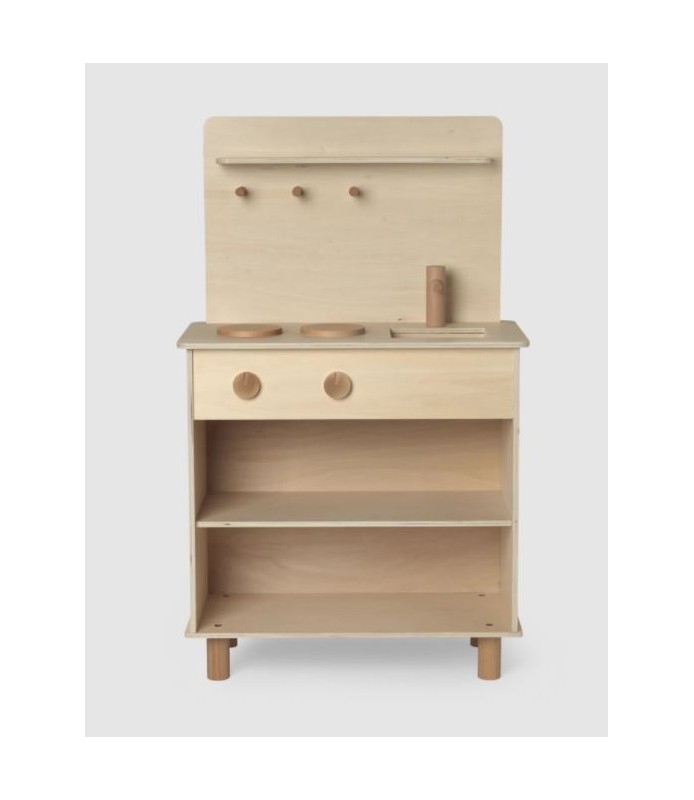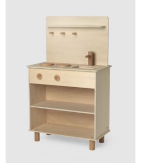 Esta pequeña cocina de juguete nunca puede tener demasiados cocineros. Practique la preparación de sus comidas favoritas o invente recetas nuevas y fantásticas. Hecho de madera contrachapada natural, deja espacio para la imaginación infantil y es una opción contemporánea y elegante que se puede colocar en cualquier lugar de la casa. La cocina tiene un fregadero con grifo, dos fogones, tres ganchos para todos sus utensilios y estantes de almacenamiento. Los detalles están hechos en madera de haya maciza natural, pero ligeramente tonificada para que se destaquen del resto.