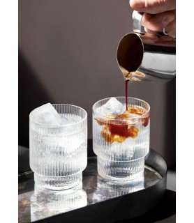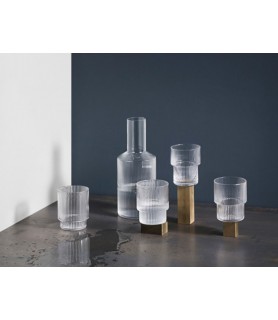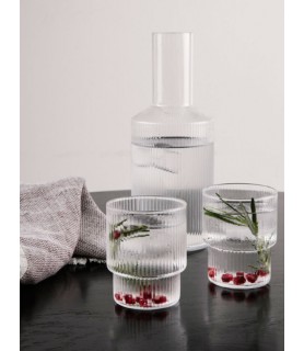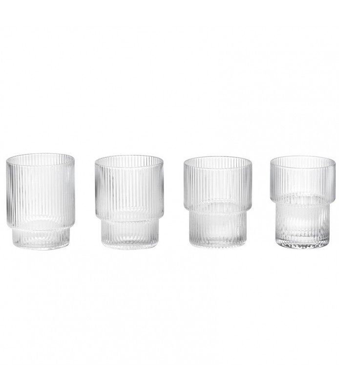 Soplados con la mano en el molde, este juego de cuatro vasos presenta una hermosa superficie ondulada. Las ondas verticales añaden una apariencia fuerte y sofisticada y las variadas formas geométricas crean dinámica y energía entre las gafas y funcionan como un elemento de diseño apilable. Combínalos con la jarra a juego para crear un conjunto elegante para el desayuno, el almuerzo o la cena.