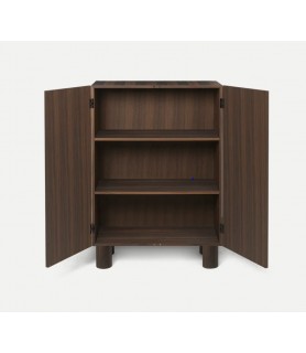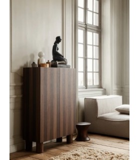 Inspirado en el brutalismo, el gabinete de almacenamiento Post juega con los volúmenes para presentar una solución de almacenamiento notable con detalles elaborados que lo atraen. Hecho de madera con certificación FSC™ Mix, el gabinete presenta detalles de madera a rayas enchapada en roble que se logró a través de un intrincado y una técnica de carpintería que requiere mucho tiempo conocida como marquetería. Conservando la expresión simple e ingeniosa del frente a rayas, las puertas del gabinete se abren y cierran con un mecanismo oculto para evitar manijas visibles.