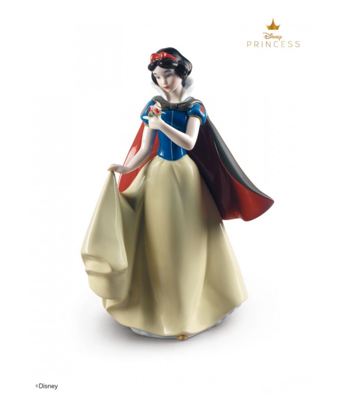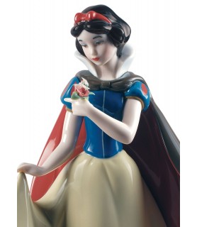 Blancanieves es una escultura de porcelana que reproduce al personaje de Disney, Blancanieves. Esta princesa conoce a un grupo de siete enanitos cuando huye de su malvada madrastra, que ha ordenado matarla para ser la más bella del reino. Acabado en porcelana brillo y decorada con los colores característicos del personaje, lleva 5 flores en su mano.