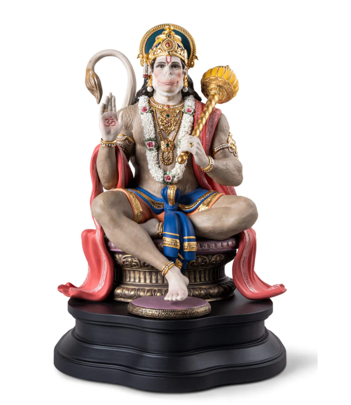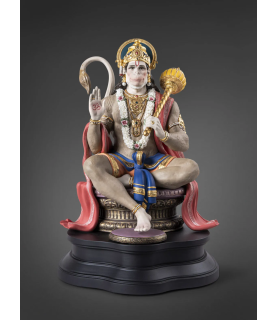Lord Hanuman es una de las deidades más veneradas en la mitología hindú. Conocido como el dios mono, es un personaje central en el 'Ramayana', una de las epopeyas más importantes de la India. Famoso por su inquebrantable devoción hacia el dios Rama, uno de los avatares de Vishnu, Hanuman es un símbolo de lealtad y coraje. Hijo de Vayu, el dios del viento, posee una gran fuerza física y poderes extraordinarios. La escultura de Lord Hanuman es una obra compleja compuesta por más de 30 fragmentos. En su decoración se emplean 15 colores diferentes, entre los que destacan los tonos metalizados y los lustres oro y perlado.
