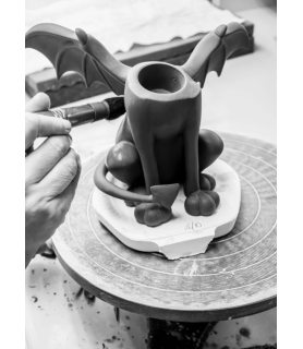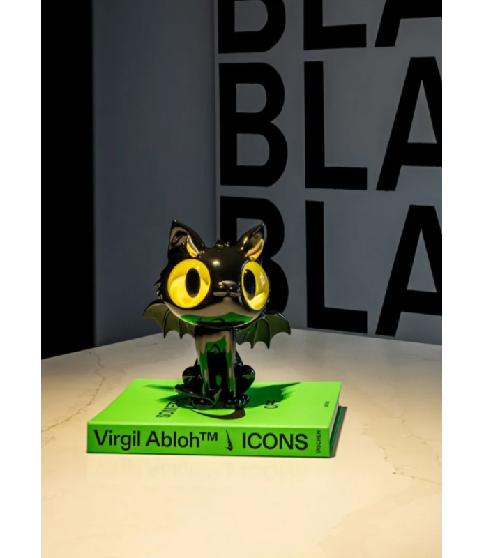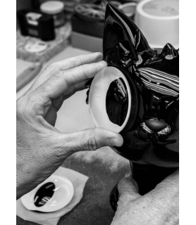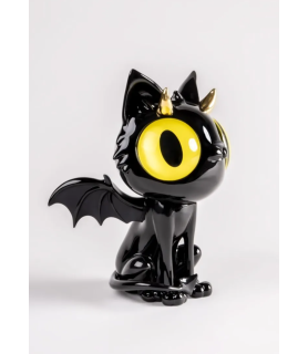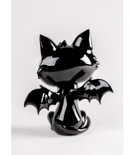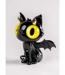 Little Devil Cat es uno de los tres personajes de la tríada You Choose One, una obra con la que Javier Calleja nos lleva a pensar en la voz de la conciencia, en ese “pepito grillo” que todos llevamos dentro y en esta ocasión, en la del pequeño diablillo. Con forma de gato, alas de murciélago, cuernecillos y cola terminada en forma de lanza, nos presenta a un diablo que más que asustar da ganas de llevárselo a casa. Sus ojos amarillos de cristal le dan un carácter muy personal y su elaboración a mano convierte a cada gato en único. Little Devil Cat está pintado en color negro cálido con acabado brillo, un tono creado ad hoc por Javier Calleja y nuestro equipo de decoración que lo ha logrado mediante el desarrollo de un negro rojizo de formulación especial. Bajo una aparente sencillez formal, Little Devil Cat esconde gran complejidad en su reproducción en porcelana. Las grandes dimensiones de su cabeza o la estructura de las alas presentan todo un reto técnico, en especial durante su proceso de cocción en el que, como todas las creaciones de Lladró, la pieza reduce un 15% su tamaño. Que esa reducción sea exitosa y que la pieza conserve su proporcionalidad requiere de muchos estudios previos y de un control máximo sobre la porcelana. El resultado es una obra de arte única firmada por uno de los artistas más cotizados en el mundo del arte contemporáneo. Un gato que por muy diablillo que sea, o quizás por ello, enamora.
