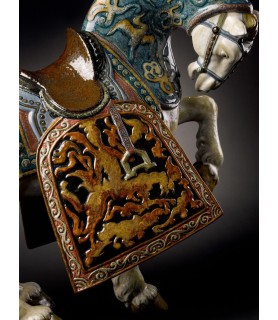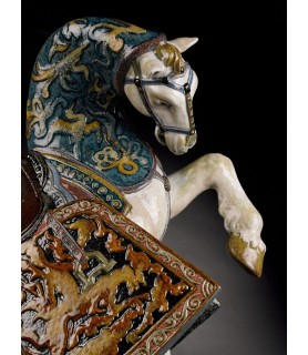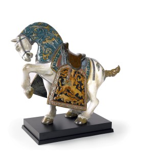 Escultura Caballo oriental de serie limitada en porcelana brillode color blanco y tonos marrones, ocres y azules.