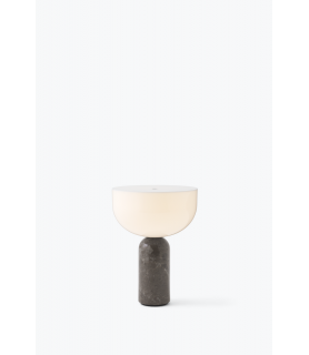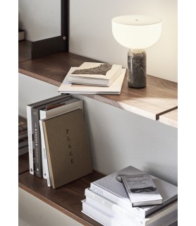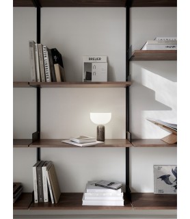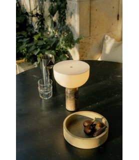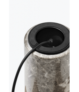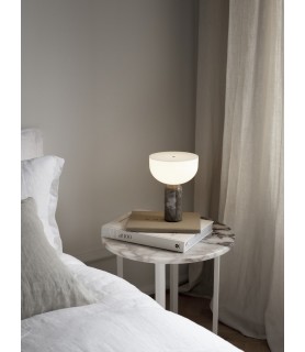 Equilibrando formas audaces, la lámpara de mesa Kizu intriga la vista con su composición escultórica, y esta versión portátil de la lámpara no es una excepción. Los materiales y la expresión son como los conocemos, pero este tamaño más pequeño e inalámbrico es fácil de mover donde se necesita luz. Con el mármol como elemento portante, la lámpara obtiene una estabilidad natural y la piedra pulida se siente cómoda al tacto.