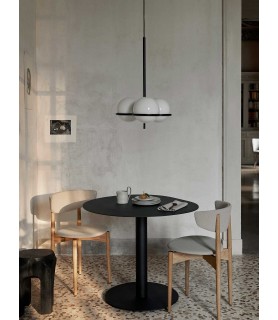 Material: hierro con recubrimiento en polvo. Cristal opal blanco. Toma E27. Cordón de tela de 5 metros en un color a juego