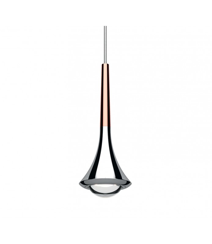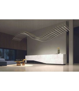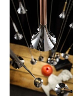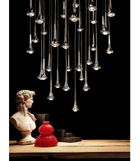La lluvia cae sobre el techo como un chaparrón primaveral, con un movimiento lineal que acentúa las sinuosas formas cónicas de su cuerpo. Una suspensión metálica con fuente de luz LED, sencilla y eficaz, elegante y extremadamente luminosa, para utilizar sola o en composiciones escénicas.
