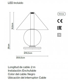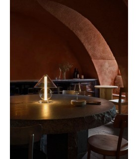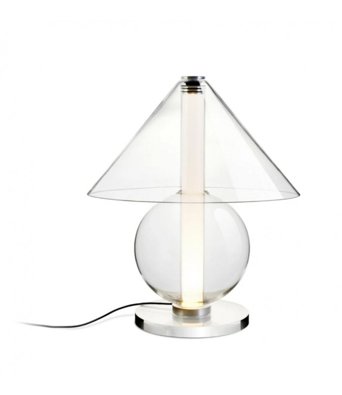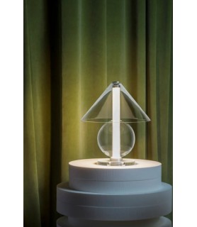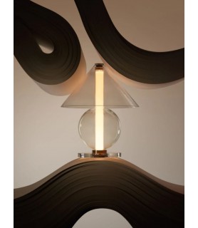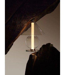 Fascinado por el diseño atemporal, al diseñador Jaume Ramírez le interesa el arquetipo de lámpara de mesa en el que una pantalla reparte la luz en todas direcciones. Este es el punto de partida sobre el que reflexiona y experimenta para proponer un nuevo diseño de vidrio, con formas más nítidas. La Fragile mezcla figuras geométricas, un cono y una esfera se disponen para acoger un cilindro que emite luz de ambiente desde abajo.