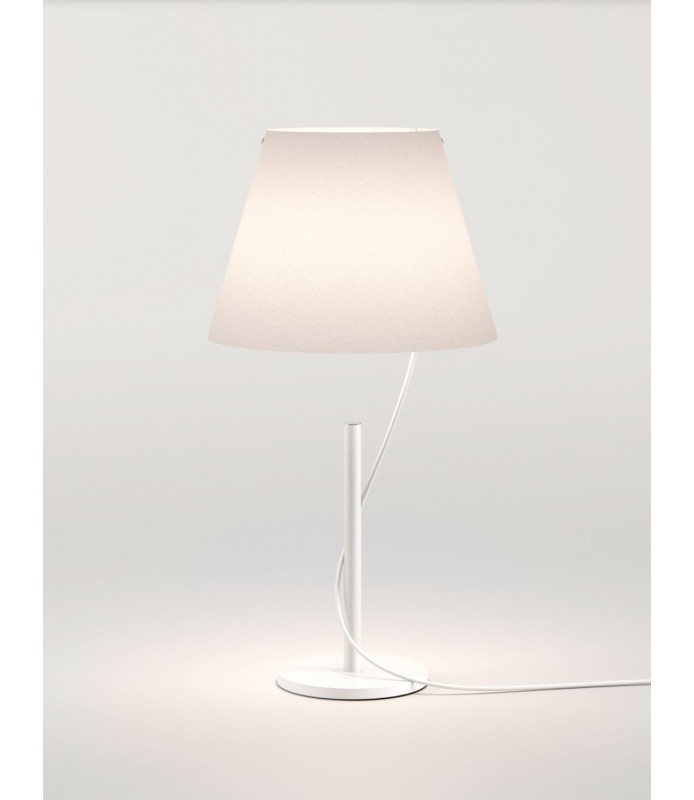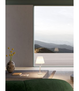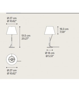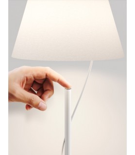 Las lámparas de sobremesa y de pie Hover poseen una pantalla que parece separada de la base, conectada perfectamente por un solo cable que atraviesa la barra y luego sale. El resultado final da la sensación de que la fuente luminosa prácticamente no pesa y flota en el aire, como un globo.