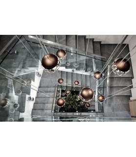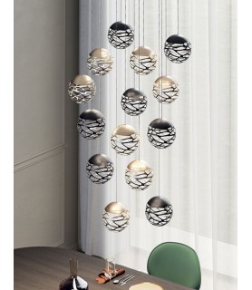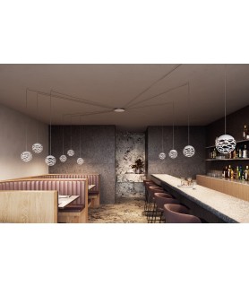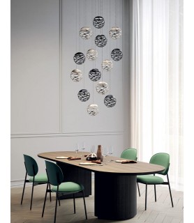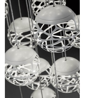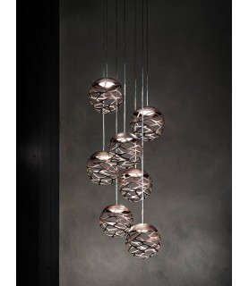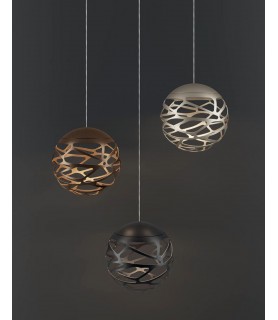 Kelly Cluster reformula brillantemente la intuición creativa de la familia de lámparas Kelly en una esfera escultural y extremadamente compacta que, montada en un florón, permite crear múltiples composiciones a voluntad. Lámpara colgante de metal, ligera y alegre gracias a los cortes especiales de láser que crean fascinantes juegos de luz y sombra, está disponible en cuatro acabados diferentes capaces de resaltar cualquier ambiente.