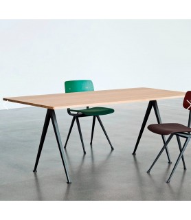 Diseñada para ser funcional, ligera y resistente, la mesa Pyramid cuenta con una base de chapa de acero con un tablero rectangular de roble. Creada originalmente por Wim Rietveld mientras trabajaba en Ahrend en los años 50, HAY ha relanzado la colección de acero recortado junto con Ahrend. La mesa está disponible en dos modelos (con y sin voladizo) y es adecuada para su uso en una amplia gama de instituciones educativas, entornos corporativos y hogares privados. Ambas variantes están disponibles en una variedad de acabados de madera y colores de base que se pueden coordinar con la silla Result y el banco Pyramid.