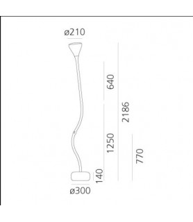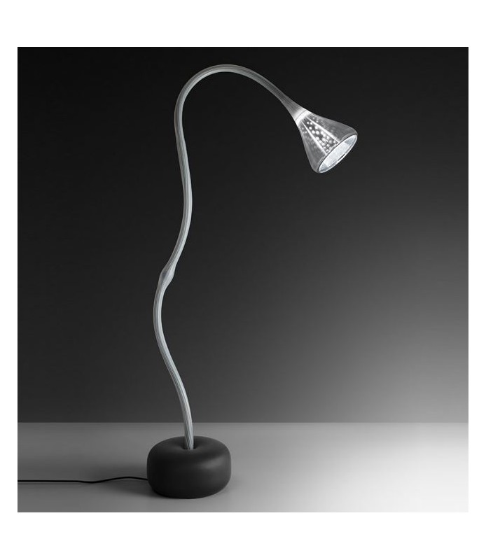 Base de acero pintado efecto “soft touch”; vástago recubierto por una funda de silicona platinada natural (antiamarilleo); difusor de policarbonato transparente con revestimiento efecto goma; lente transparente; Refl ector interno fabricado en aluminio especular con perforaciones aleatorias. El nuevo difusor interno reinterpreta la antigua lámpara fluorescente utilizando una moderna fuente LED, esto garantiza el mismo rendimiento óptico con menor consumo de energía y una mejor calidad de luz.