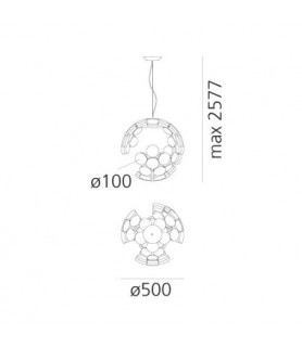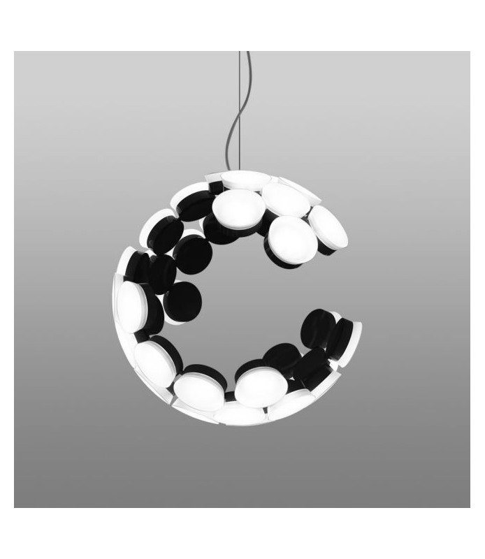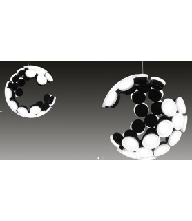 Creada a partir de la repetición de un módulo elemental, esta lámpara de suspensión consta de una esfera con una estructura incompleta. Siempre cambiante en su apariencia, según el punto desde el que se mire, rompe radicalmente el molde de las formas puras y a veces monótonas que normalmente caracterizan a este tipo de lámparas.