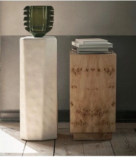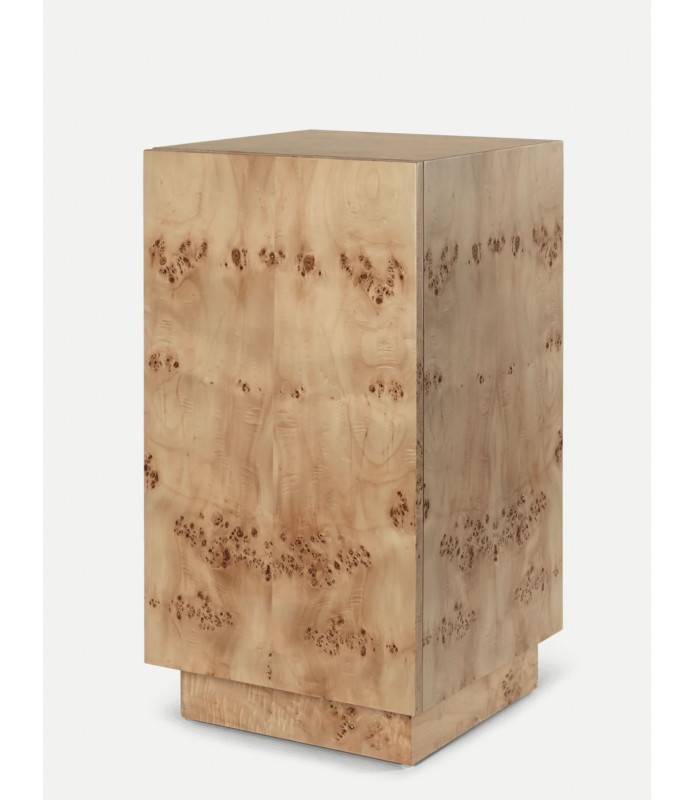 La mesa auxiliar Burl debe su nombre a la madera de nudo bellamente estampada y certificada FSC™ de la que está hecha. Esta pieza versátil y elegante sirve como mesita de noche y mesa auxiliar, adaptándose sin esfuerzo a tus necesidades. Su espacio de almacenamiento oculto incluye un estante ajustable que se puede mover según los artículos que se almacenen. El diseño en forma de pedestal irradia una expresión elegante que realza la estética general y el ambiente de cualquier espacio.