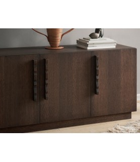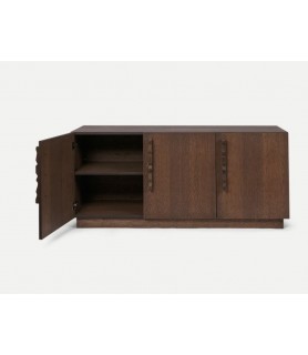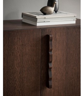 El aparato Unda está elaborado en roble certificado FSC™ teñido de oscuro y presenta una estética robusta y clásica que contrasta con los divertidos tiradores ondulados. Esta interacción entre practicidad y fantasía da como resultado una pieza atemporal que se adapta a cualquier espacio. La estantería interior del aparato Unda es modular, lo que le permite ajustar la altura según sus necesidades de almacenamiento.
