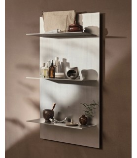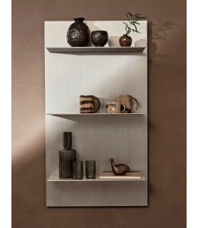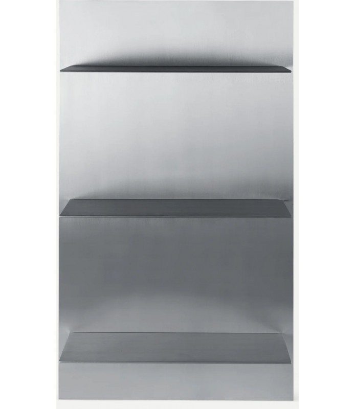 Elaborado en aluminio y haciendo referencia a la estética industrial y brutalista, el estante de pared Lager ofrece almacenamiento elegante y funcional en cualquier espacio. Su diseño facilita una instalación simple en la pared utilizando un sistema de suspensión con listones franceses, y el espacio uniforme entre las secciones permite apilar múltiples estantes, perfecto para una exhibición de biblioteca alta y cohesiva.