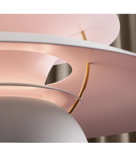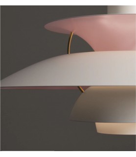 Exterior pintado en húmedo de color blanco e interior con recubrimiento en polvo de color rosa pálido, aluminio lacado mate. Pantalla antirreflectante: Rosa pálido. Puntales: Latón metalizado, aluminio laminado. Difusor: Vidrio esmerilado. Campaña: De color blanco. Cable: 3m, tejido blanco