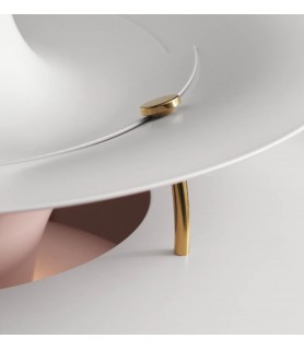 Esta edición del aniversario está pintada en blanco mate en el exterior, con rosa pálido en el interior, que proporciona una luz suave y cálida, mientras que los soportes hechos de latón metalizado añaden un toque precioso al diseño.
