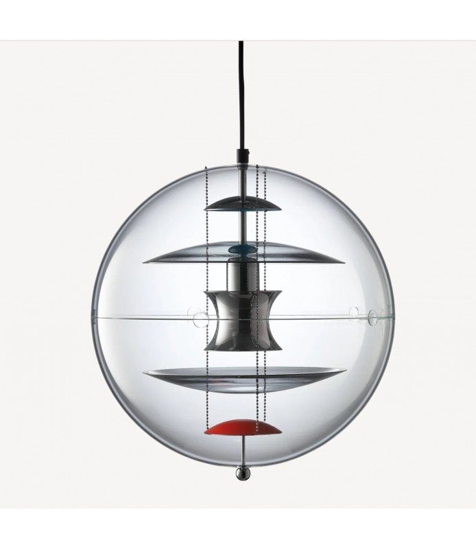 Esfera con cinco reflectores internos suspendidos por tres cadenas de acero. Los toques de rojo y azul añaden los toques finales al diseño escultórico futurista y resaltan el inconfundible ADN del diseño de Panton. Con la VP Globe, la ambición de Panton era diseñar una lámpara que pudiera llamar la atención y unir una habitación, independientemente de si colgaba sola o en grupos. Esto hace que el colgante sea una opción ideal sobre la mesa del comedor, en un pasillo o pasillo largo, o como elemento escultórico en un rincón.