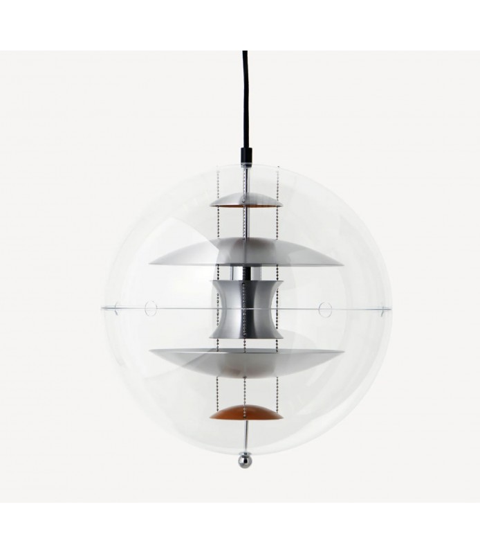 Concebido en 1969 por Verner Panton, el VP Globe es posiblemente el diseño de iluminación de Panton más reconocido. El colgante decorativo presenta una capa exterior de acrílico transparente como el cristal con cinco pantallas reflectoras internas suspendidas por delicadas cadenas de acero.