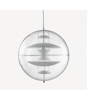 Este colgante decorativo VP Globe Glass presenta una esfera exterior de acrílico transparente con cinco reflectores internos suspendidos por tres cadenas de acero. Los reflectores de cristal blanco opalino facilitan el paso de la luz. Con la VP Globe, la ambición de Panton era diseñar una lámpara que pudiera llamar la atención y unir una habitación, independientemente de si colgaba sola o en grupos. Esto hace que el colgante sea una opción ideal sobre la mesa del comedor, en un pasillo o pasillo largo, o como elemento escultórico en un rincón.