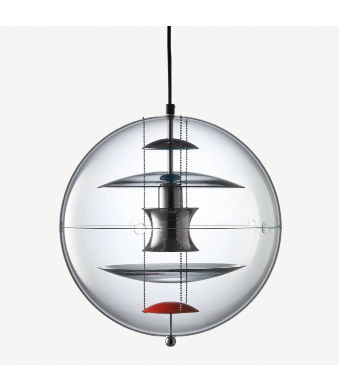 Este colgante decorativo VP Globe Coloured Glass presenta una esfera exterior de acrílico transparente como el cristal con cinco reflectores internos suspendidos por tres cadenas de acero. Los toques de rojo y azul añaden los toques finales al diseño escultórico futurista y resaltan el inconfundible ADN del diseño de Panton. Con la VP Globe, la ambición de Panton era diseñar una lámpara que pudiera llamar la atención y unir una habitación, independientemente de si colgaba sola o en grupos. Esto hace que el colgante sea una opción ideal sobre la mesa del comedor, en un pasillo o pasillo largo, o como elemento escultórico en un rincón.