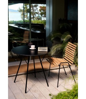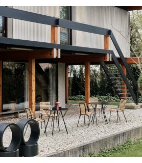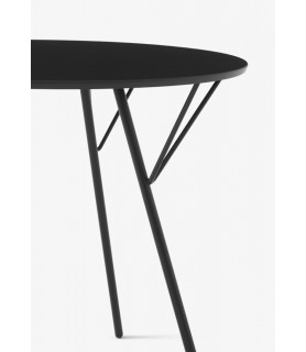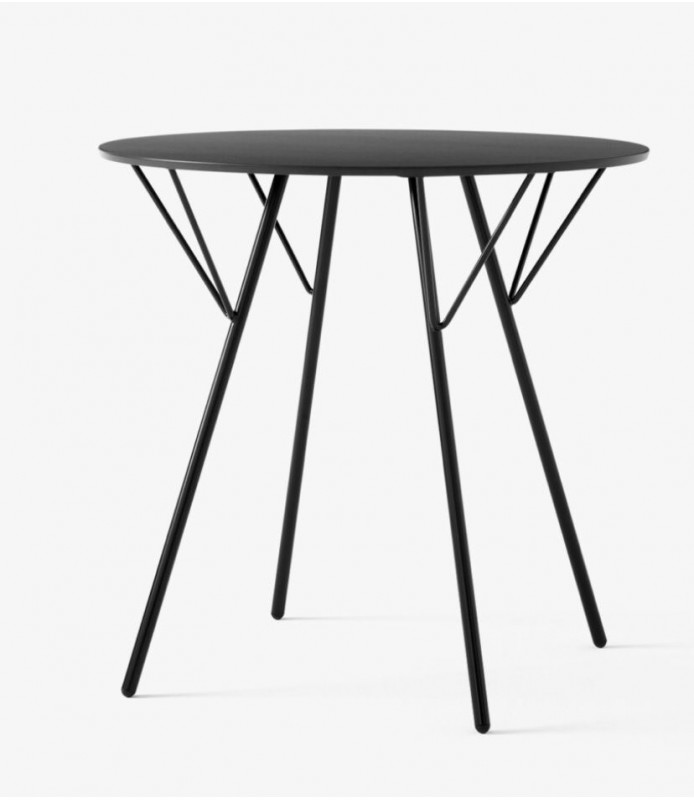 La mesa de terraza RFH, que forma parte de la colección Royal Festival Hall de Robin Day, está fabricada en acero con recubrimiento en polvo negro, lo que la hace profundamente resistente, resistente a la decoloración y al agua. Apoyada sobre cuatro patas que se extienden ligeramente en ángulo, a la mesa se le atribuye un aspecto suave pero industrial.