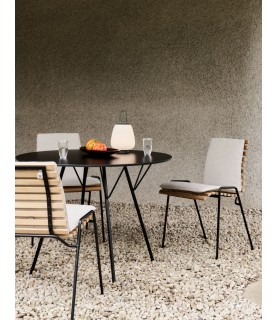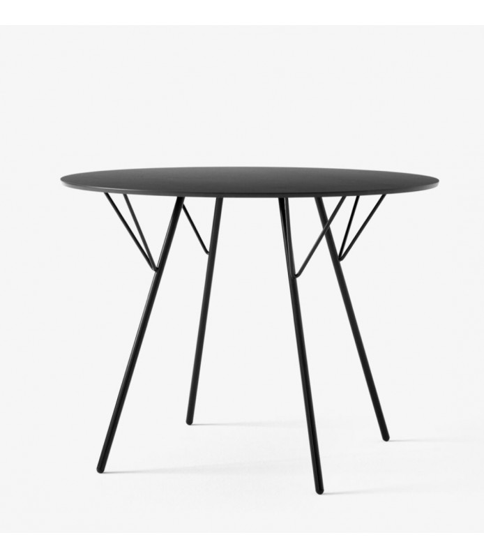 La mesa de terraza RFH, que forma parte de la colección Royal Festival Hall de Robin Day, está fabricada en acero con recubrimiento en polvo negro, lo que la hace profundamente resistente, resistente a la decoloración y al agua. Apoyada sobre cuatro patas que se extienden ligeramente en ángulo, a la mesa se le atribuye un aspecto suave pero industrial.