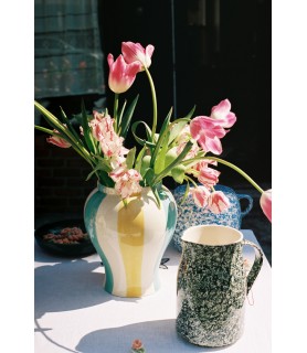 Como parte de una colaboración de diseño entre HAY y la artista Laila Gohar que celebra la alegría de reunirse con familiares y amigos durante una buena comida, el jarrón Sobremesa Stripe es un jarrón decorativo diseñado para agregar ambiente a cualquier mesa. Pintada a mano en gres con un patrón de rayas de colores que le da a cada jarra una calidad única, puede usarse para ramos de flores, ramas florecientes o para guardar utensilios de cocina. Disponible en diferentes tamaños y diseños.