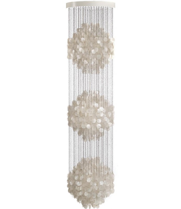 FUN 3DM Design: Verner Panton, 1964 Ø56 cm / H: 240 cm Hanging lamp with three clusters of seashell discs. Attached by chains of small metal rings. White wooden ceiling plate (incl.) Cord: Transparent Light source: 220V E27 3 x max. 60W