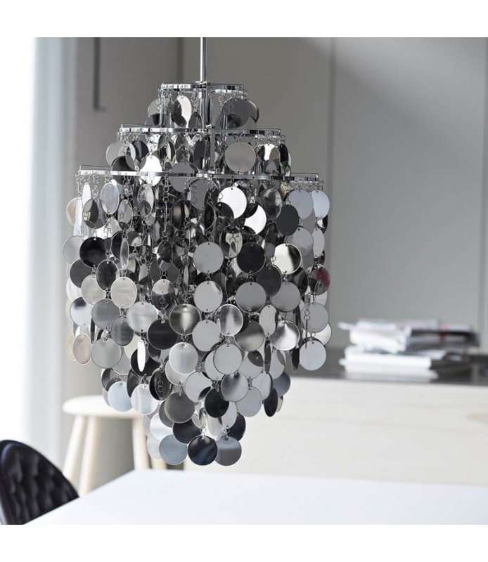 FUN 1DA Design: Verner Panton, 1964 Ø45 cm / H: 60 cm Pendant with metal discs on three ring metal frame. Discs are connected with small metal rings. Chrome ceiling canopy (incl.) Cord: 400 cm black fabric Light source: 220V E27 max. 60W