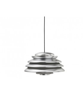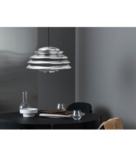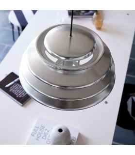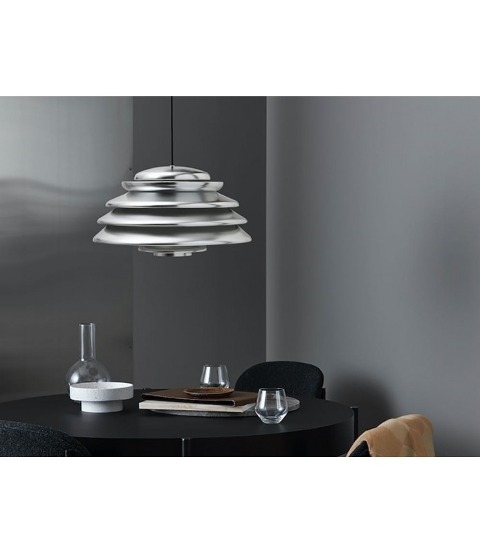 Polished aluminium pendant with direct downward light and layered shades diffusing the light throughout the surroundings.