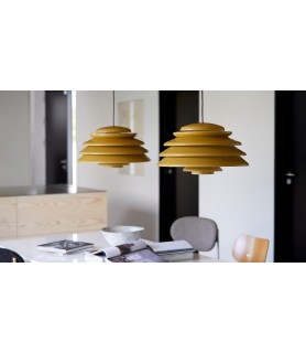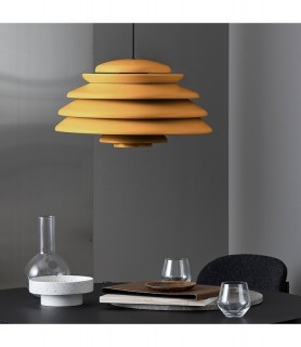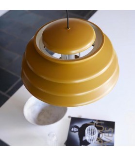 Painted metal pendant with direct downward light and layered shades diffusing the light throughout the surroundings.
