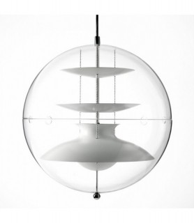 PANTO Design: Verner Panton, 1977 Ø40 cm / Ø50 cm Pendant made of transparent acrylic. White reflectors inside. Suspended by three steel chains. White ceiling canopy (incl.) Cord: 400 cm white fabric Light source: Ø40 cm: 220V E14 max. 60W Light source: Ø50 cm: 220V E27 max. 60W