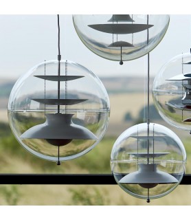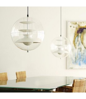 PANTO Design: Verner Panton, 1977 Ø40 cm / Ø50 cm Pendant made of transparent acrylic. White reflectors inside. Suspended by three steel chains. White ceiling canopy (incl.) Cord: 400 cm white fabric Light source: Ø40 cm: 220V E14 max. 60W Light source: Ø50 cm: 220V E27 max. 60W
