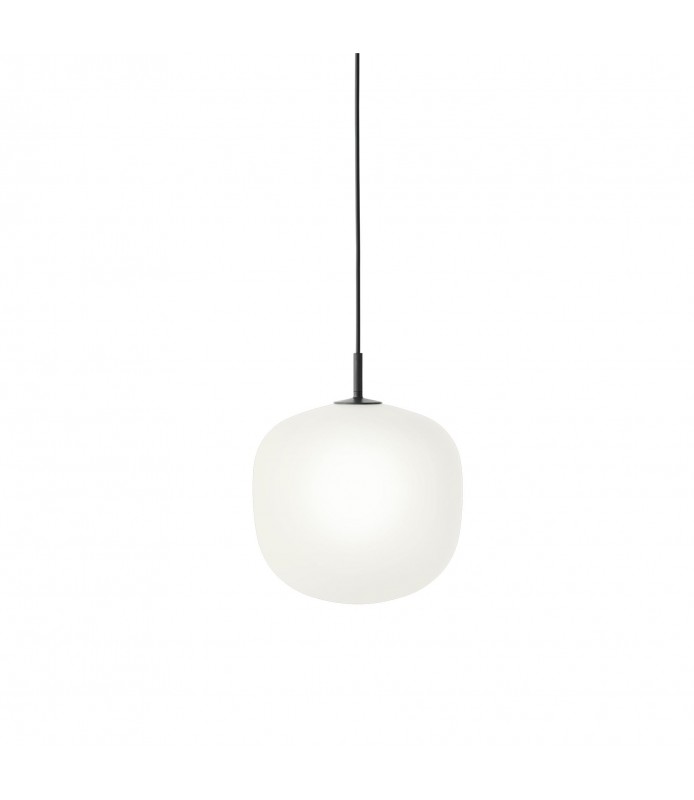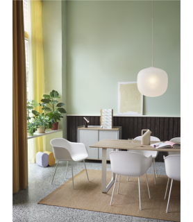 La tapa de aluminio con recubrimiento de polvo, el cordón de PVC y la fijación al techo vienen en colores a juego y están disponibles en gris, blanco, negro y naranja. La luz viene en cuatro tamaños diferentes y se puede colgar sola o en racimos. La forma del tono de cristal blanco se basa en la fruta del roble, dijeron los diseñadores.