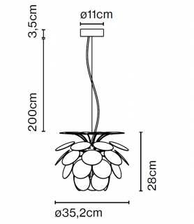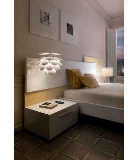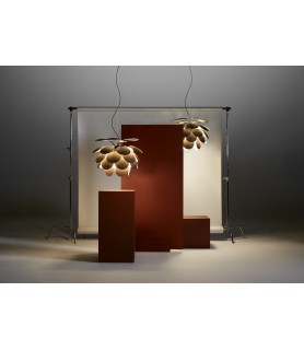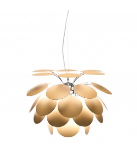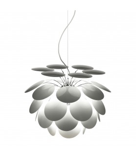 Si hay un diseño icónico en la colección de Marset es la Discocó: exuberante, también cuando está apagada, la riqueza de luz que emite esta lámpara procura una iluminación directa descendente y, al mismo tiempo, un efectista juego de luces y sombras a su alrededor. Su detallado estudio de la luz indirecta aporta varios matices lumínicos y también profundidad al objeto. La esfera cromada del núcleo, donde se fijan los discos, crea reflejos adicionales.