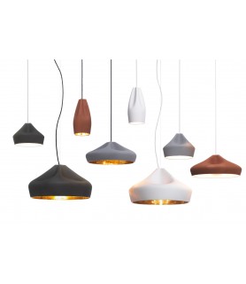 El concepto Pleat Box parte de un juego formal en el que tras diseñar digitalmente la caída del pliegue textil, se aplica la silueta al material cerámico. El exterior de la lámpara se ofrece en cerámica blanca, negra, terracota y gris, resultado del reciclaje de diferentes esmaltes.