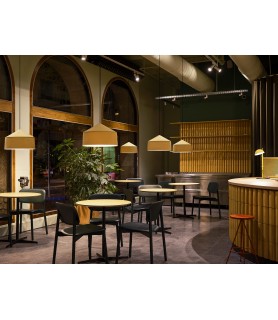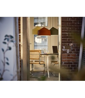 Un diseño sencillo que recuerda a una casa circular, un arquetipo de formas esenciales que funcionan también combinándose entre sí, en distintas alturas y colores, para ofrecer múltiples posibilidades de iluminación.