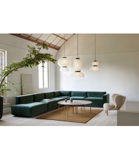 Oriente se encuentra con Occidente en el divertido cambio que hace Jaime Hayon de una linterna tradicional asiática en una expresión contemporánea. Desde hace siglos, las linternas de papel han aparecido en Asia entre los privilegiados y los pobres, donde diferentes colores, formas y tamaños connotan diferentes significados. Aquí Hayon ha prescindido de formalidades culturales para crear una serie de lámparas íntegramente en blanco. Hecho a mano con papel de arroz fusionando varios tamaños y formas. La serie se compone de tres versiones diferentes de farol y una lámpara de mesa en papel de arroz blanco marfil con detalles en roble teñido de negro.