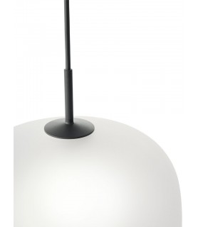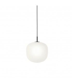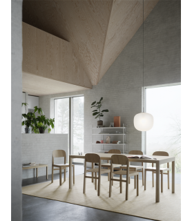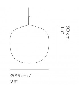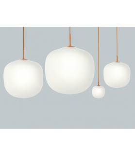 La tapa de aluminio con recubrimiento de polvo, el cordón de PVC y la fijación al techo vienen en colores a juego y están disponibles en gris, blanco, negro y naranja. La luz viene en cuatro tamaños diferentes y se puede colgar sola o en racimos. La forma del tono de cristal blanco se basa en la fruta del roble, dijeron los diseñadores.