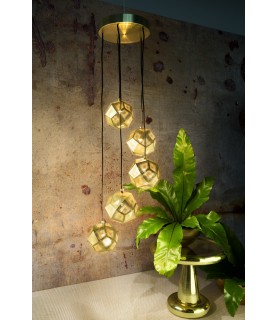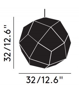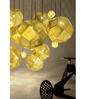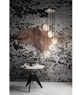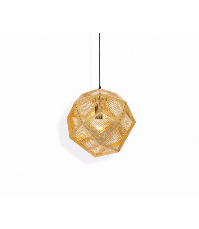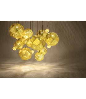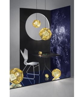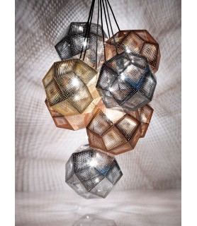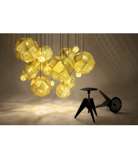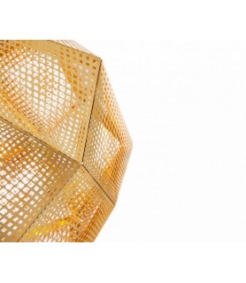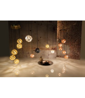 Inspirada en la lógica de las matemáticas puras, la gama Etch es una serie de estructuras geodésicas hechas de finas láminas de metal grabadas digitalmente. Los colgantes presentan un patrón detallado que proyecta una masa de sombras intrincadas cuando se enciende.