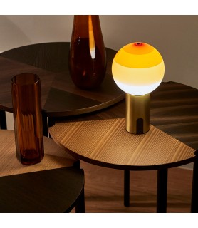 Dipping Light nace como un experimento -sumergir una bombilla encendida en pintura varias veces- pero se convierte en una lámpara. Así las varias capas de pintura dibujan círculos concéntricos y atrapan la luz, atenuando su intensidad. La pintura se convierte en pantalla, coloreando la luz y confiriéndole textura. Como soporte se añade una base de latón o grafito. Este proceso artesanal hace que cada lámpara sea única y exclusiva.