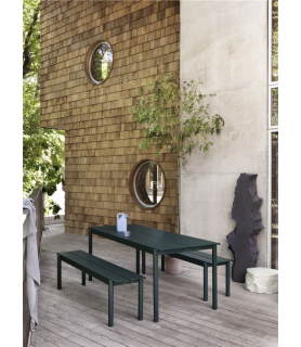 El banco de acero lineal aporta nuevas perspectivas a los muebles de exterior modernos a través de sus líneas rectas a lo largo de los bordes plegados, las patas de intersección semicirculares y el pequeño espacio para una fácil extracción del agua. Mantenido visualmente limpio para una estética duradera, el banco lineal de acero encuentra su carácter distintivo a través de detalles sutiles y una expresión simple, lo que le permite complementar cualquier entorno al aire libre. El banco de acero lineal está diseñado en proporciones que le permiten deslizarse fácilmente debajo de la mesa de acero lineal correspondiente.
