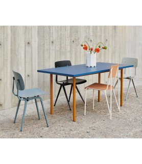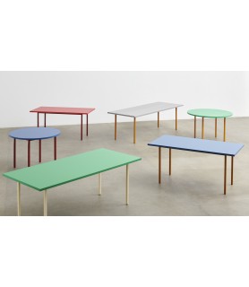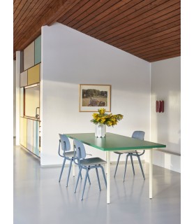 Descrita por los diseñadores belgas Muller van Severen como un matrimonio entre dos materiales utilizados en su mejor momento, la serie de mesas Two-Colour se inspira en los contrastes y similitudes de los materiales utilizados. Con patas de tubo de acero para una resistencia y estabilidad óptimas, la superficie de la mesa está fabricada en Valchromat de color orgánico, un tipo único de material MDF robusto que cuenta con la certificación FSC y cuenta con una laca a base de agua. Ambos componentes están unidos por el grosor uniforme, creando una silueta uniforme que se ve interrumpida por los elementos de contraste de color.