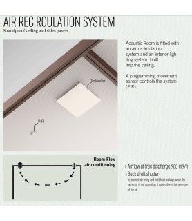 Acoustic Room is fitted with an air recirculation system and an interior lighting system, built into the ceiling. A programming movement sensor controls the system (PIR).