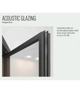 The glass is laminated, you can choose single 6mm or acoustic glass 5+5 mm. Laboratory tests on double-glazed glass walls show noise reduction of up to 42 dB.