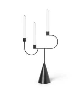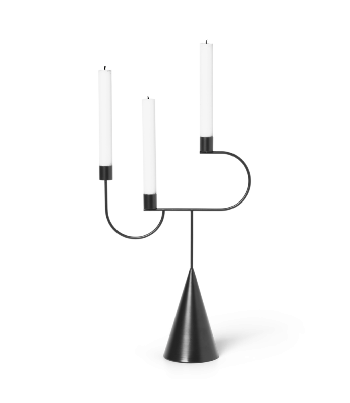 Llevando el arte del equilibrio a un nuevo nivel, este candelabro tiene una voluminosa base cónica y tres soportes para una vela estándar. El diseño presenta nuestra visión de un candelabro moderno, con elementos que dibujan una línea hacia atrás en el tiempo y otras que apuntan hacia adelante. Está fabricado en metal con recubrimiento en polvo con un acabado liso y viene en más colores.