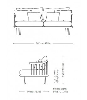 Material: Estructura y base de roble aceitado. Almohadas de espuma HR y plumas. Tapicería de tela