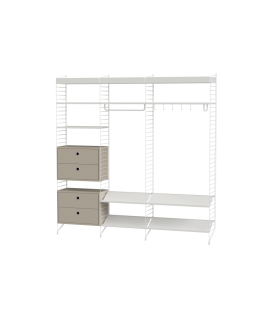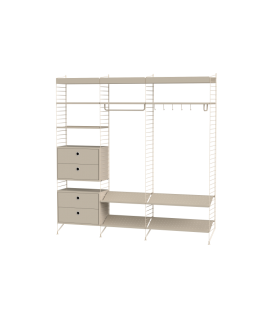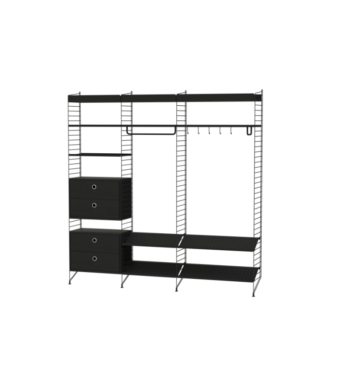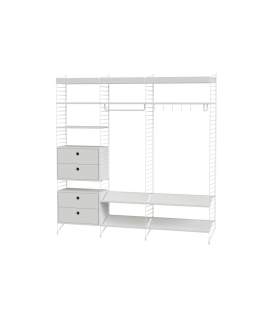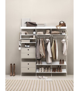 ¿Tiene suerte y su pasillo es espacioso? Si es así, tenemos la solución perfecta para usted. Esta combinación tiene realmente de todo. Cajones, estantes para zapatos, estantes metálicos de borde alto y bajo, y muchísimas oportunidades para colocar accesorios tales como barras de colgar y ganchos, en el lugar que prefiera.